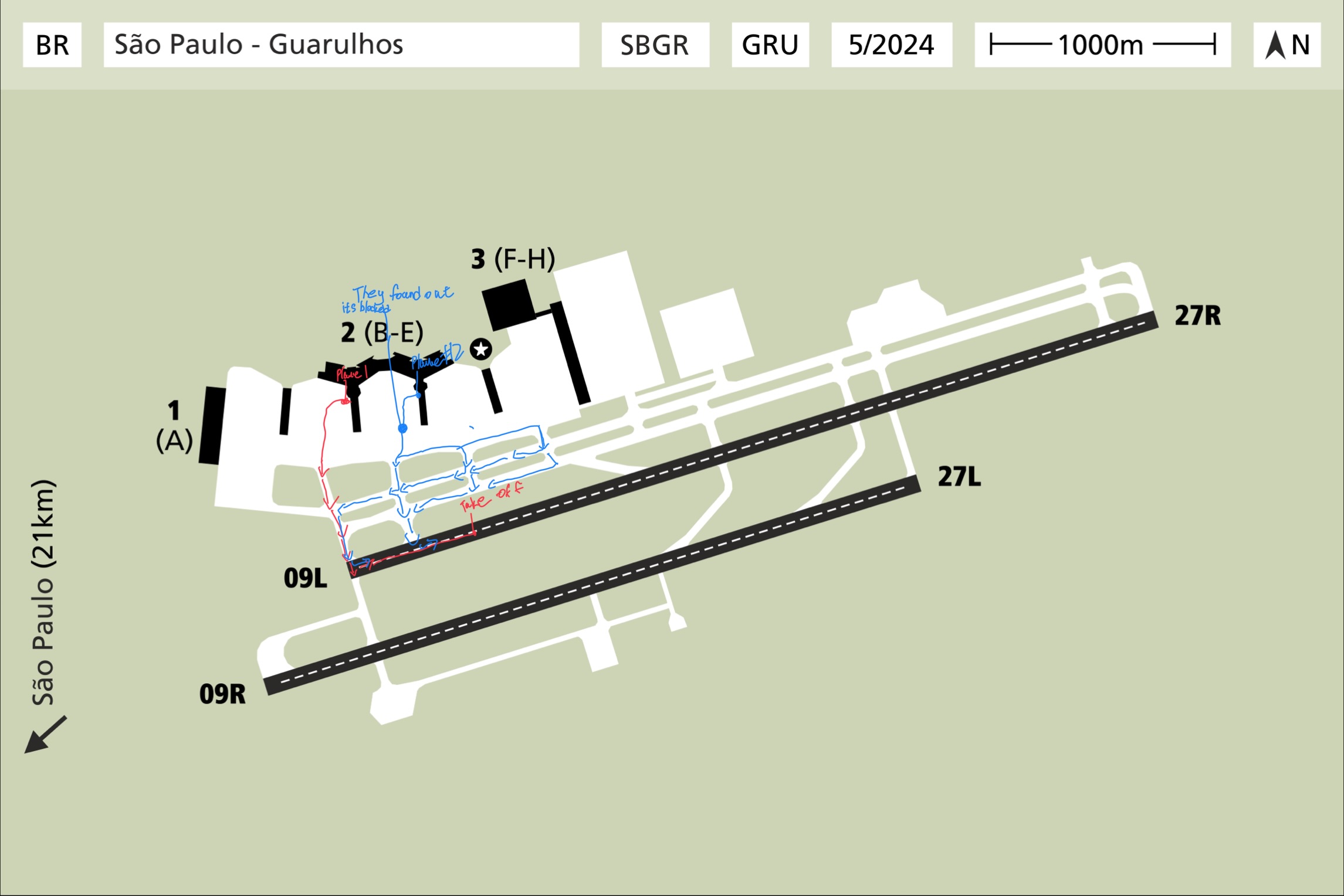 Using GRU as an example, if the aircraft is departing from Y2, they will check if a direct taxi to runway 10L is reserved by other aircraft. If it is, it will follow the second parallel taxiway to the move to Y3 and make a U-turn to the first parallel taxiway, line up. We assume the taxiway between Y2 and Y3 can load 4 aircraft; if it is not full, it will turn and wait. If it is full, it will continue taxiing to Y4 and make the U-turn.