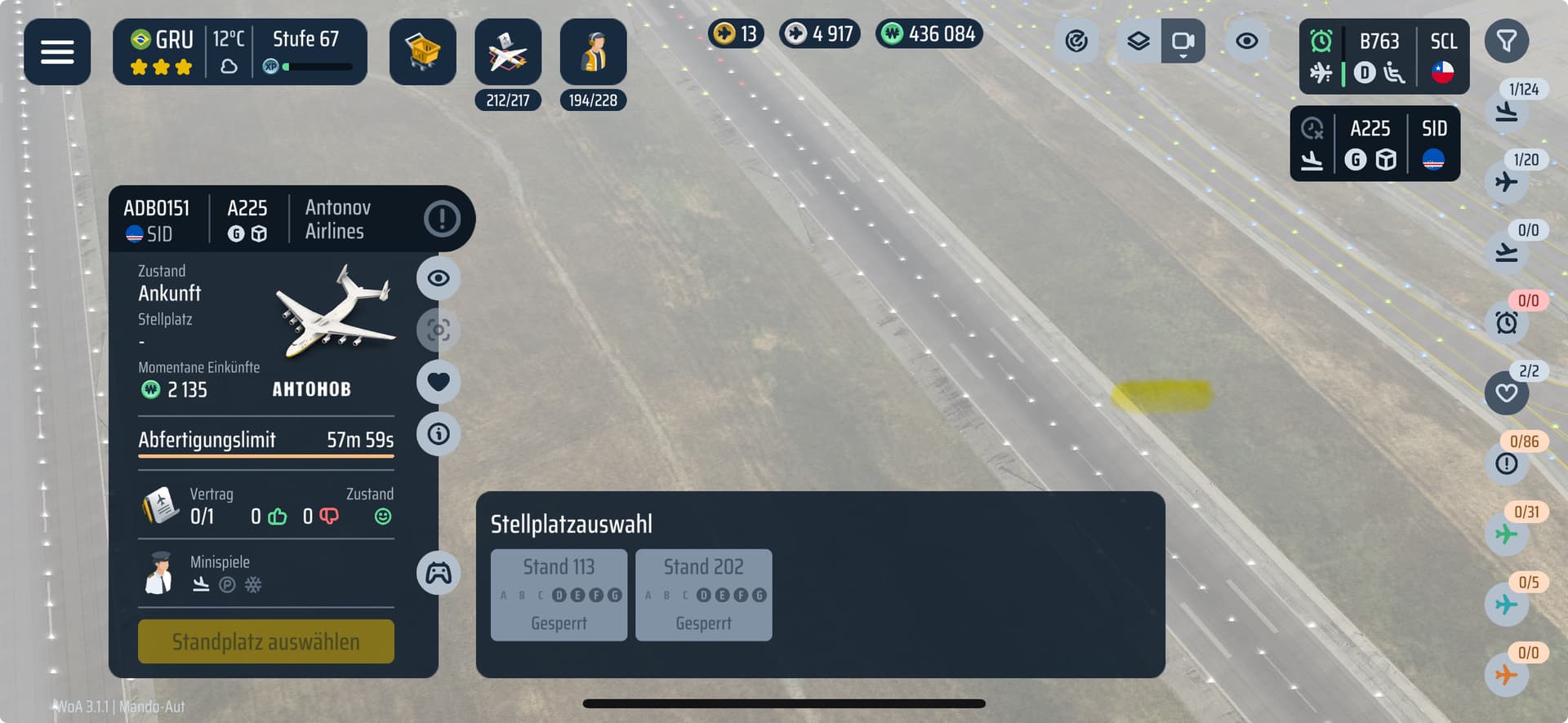 If you had both of these large stands as well as all the smaller stands that can block them free, there would be no problem. If you have no planes assigned to the stands 113 and 202, then go to the construction menu, click on them and the mutually exclusive stands will be marked red. Then check the marked stands, if any of them will say they’re occupied, you’ll need to handle those planes first before assigning the An-225.