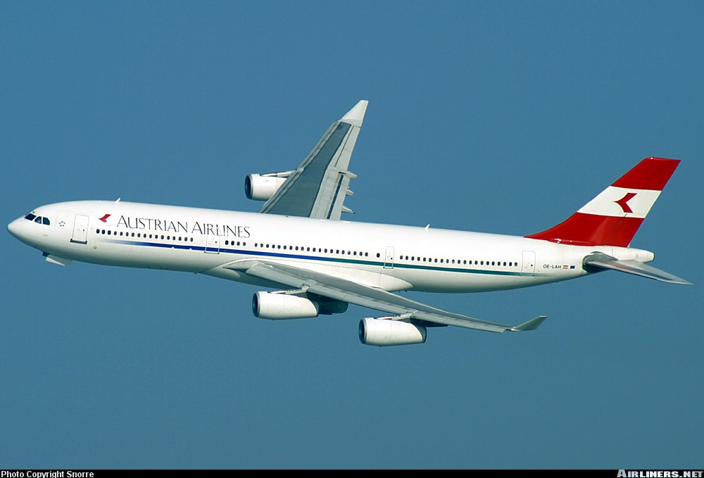 Austrian Airlines in the 2000s livery colorway on an Airbus A340-200.