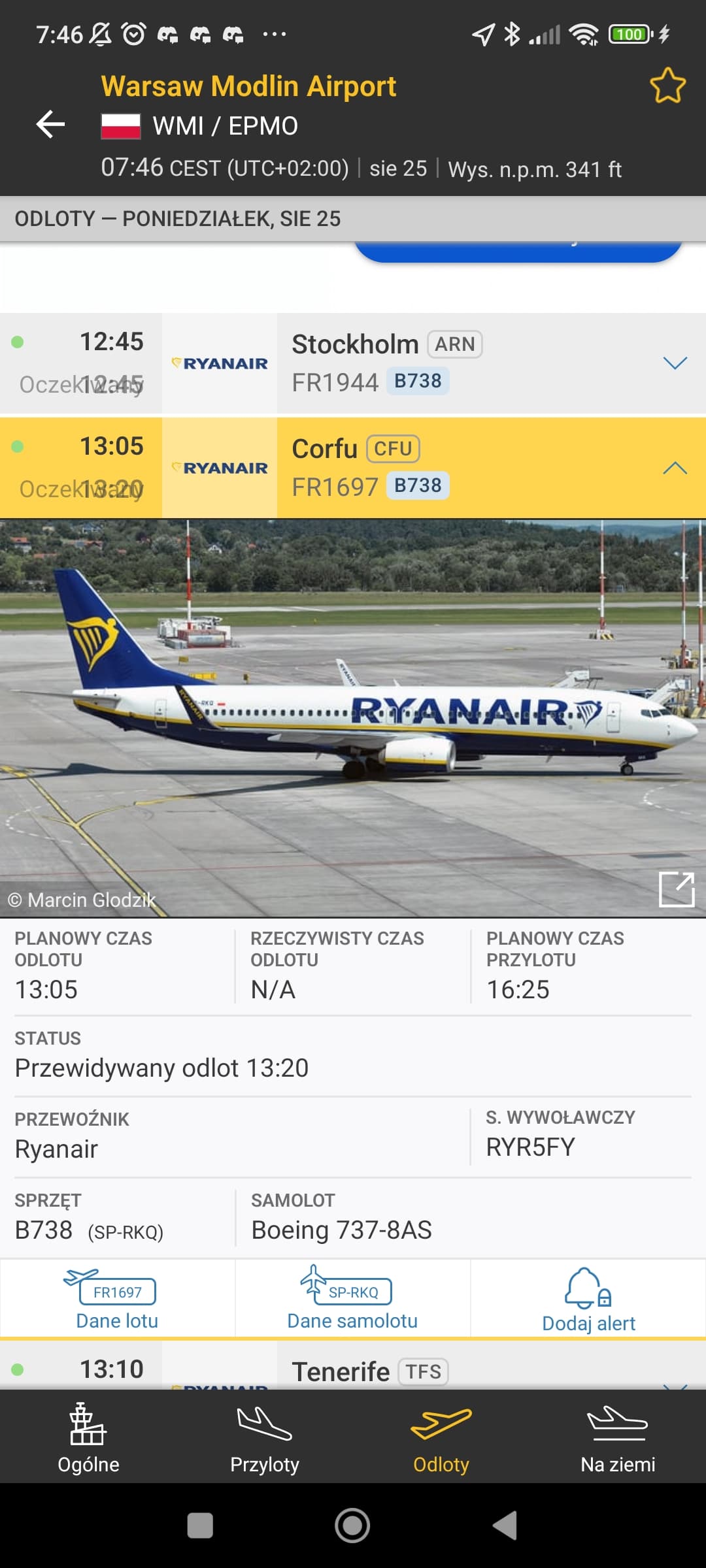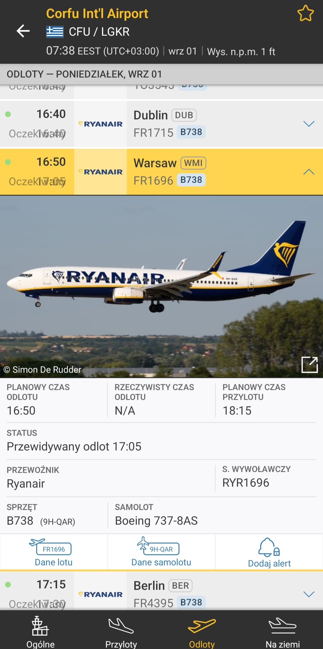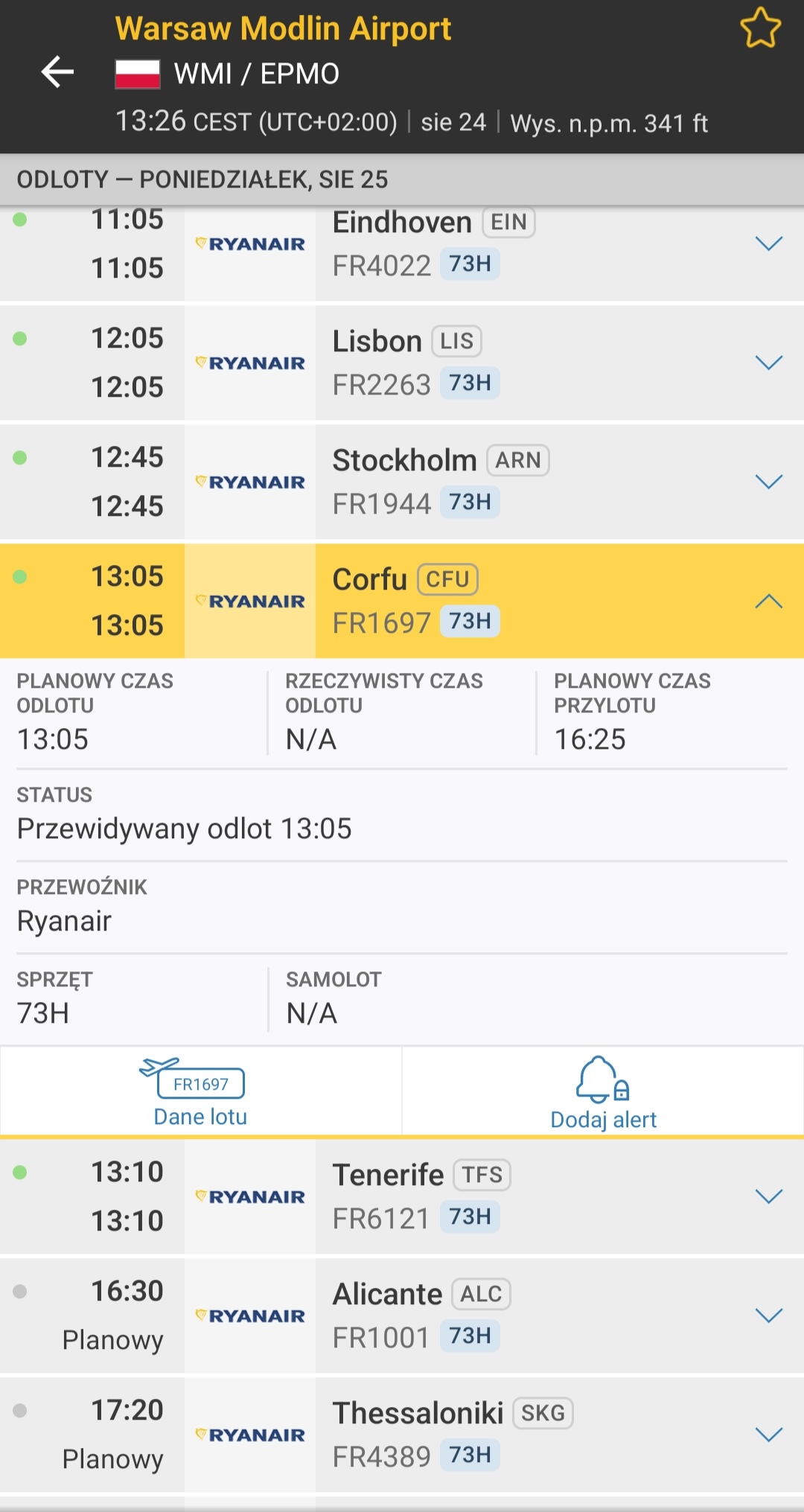 My flight to CFU allredy shown on Flightradar24 Modlin’s departures.