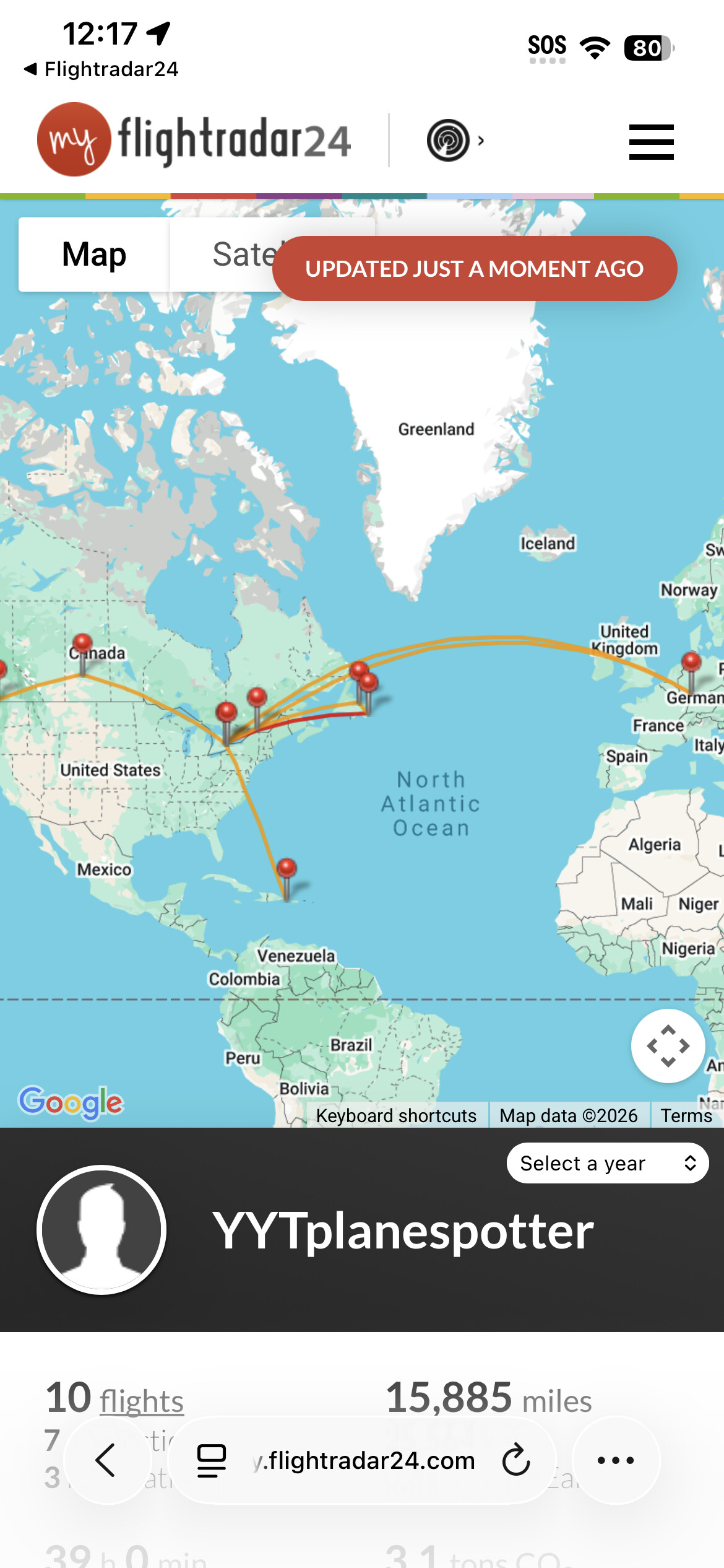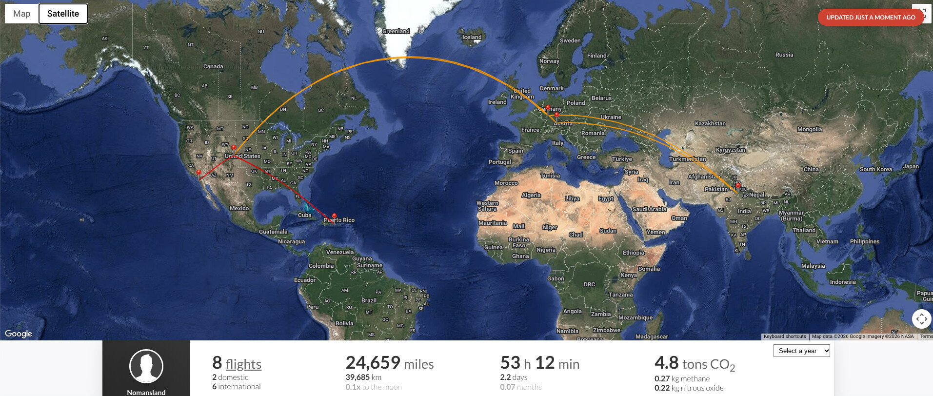Here’s the website. You add the date and the flight from your past or upcoming trips, and it shows everything on one map with accumulated statistics