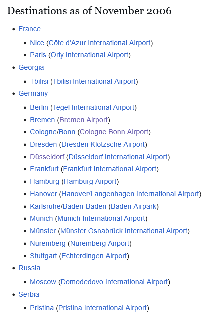 Destinations from wiki (Trying to get Wayback Machine to work but it keeps forcing me into Air Berlinβs site),