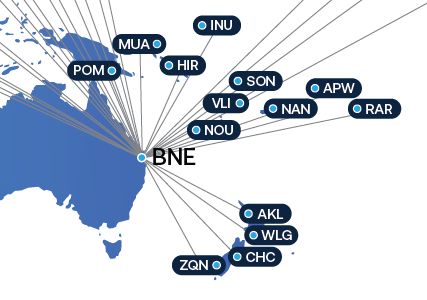•Qantas : Apia, Auckland, Cairns, Christchurch, Darwin, Koror, Mackay, Melbourne, Mount Isa, Norfolk Island, Perth, Port Moresby, Port Vila, Queenstown, Sydney, Townsville, Wellington.