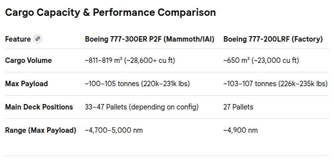 B77WF is a converted passenger aircraft (P2F) so it carries less than the purpose built B77LF