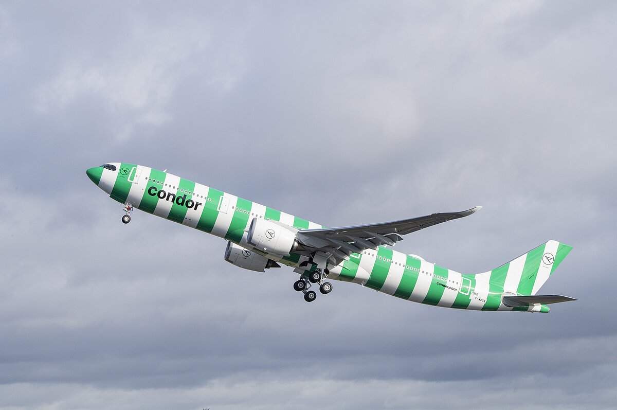 The fuselage of an A330neo has stripes in the colors blue, gold, and green; their names are shown above the photos below.