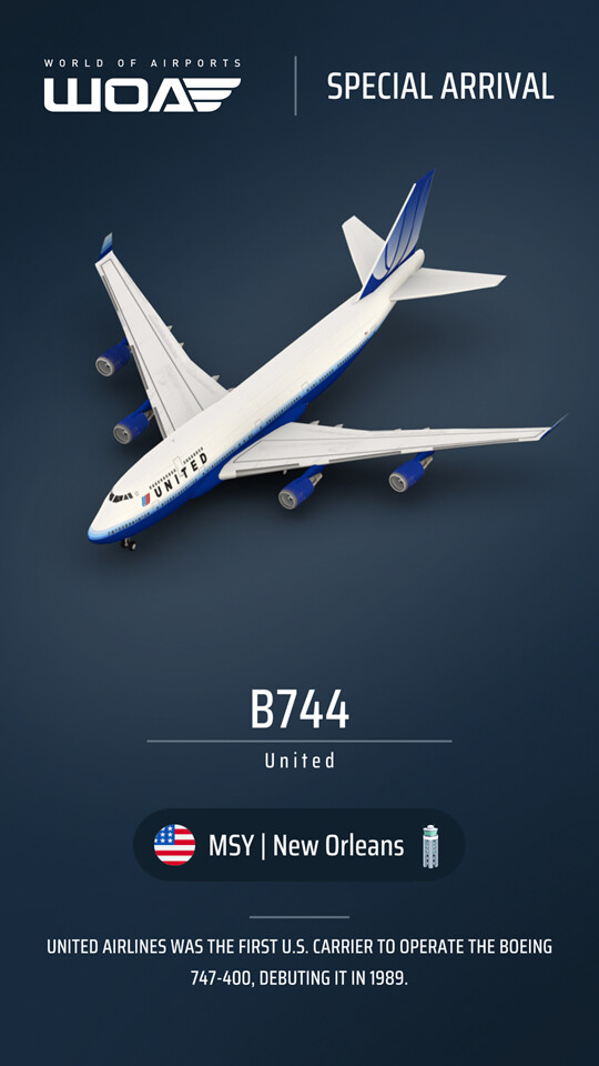 | MSY | IAD | United Airlines | B744 | Boeing 747-400 | 2004 (Rising Blue) livery | Yes | One of my all time favourite liveries, need the whole fleet for my regular IAD ops | |
