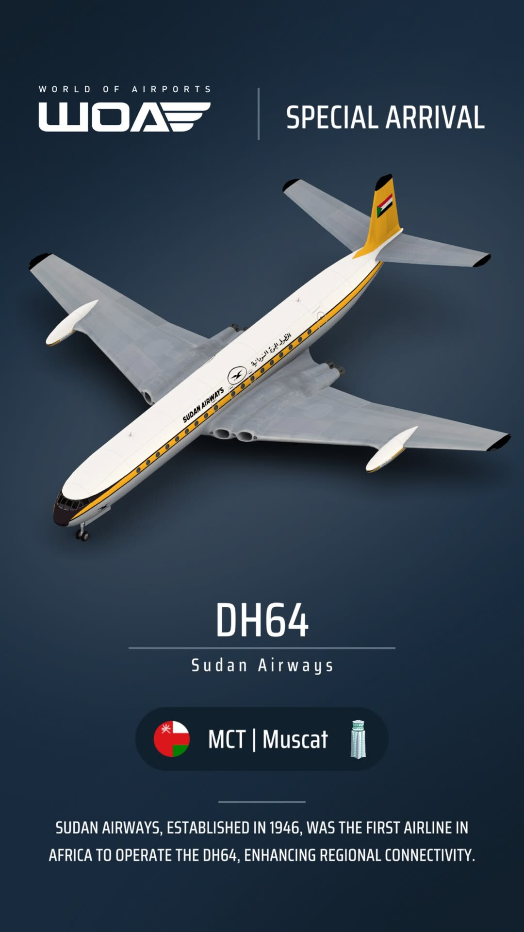 | MCT | KRT | Sudan Airways | DH64 | De Havilland Comet IV | Yes | |||
