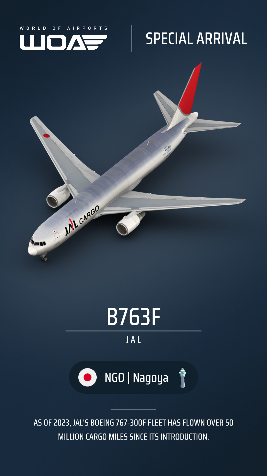 | NGO | NRT | Japan Airlines | B763 | Boeing 767-300 | Chrome livery | Yes | ||