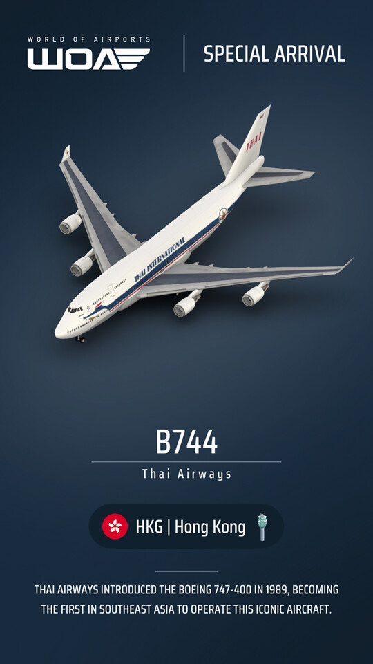 | HKG | BKK | Thai Airways | B744 | Boeing 747-400 | Retro livery | Yes |