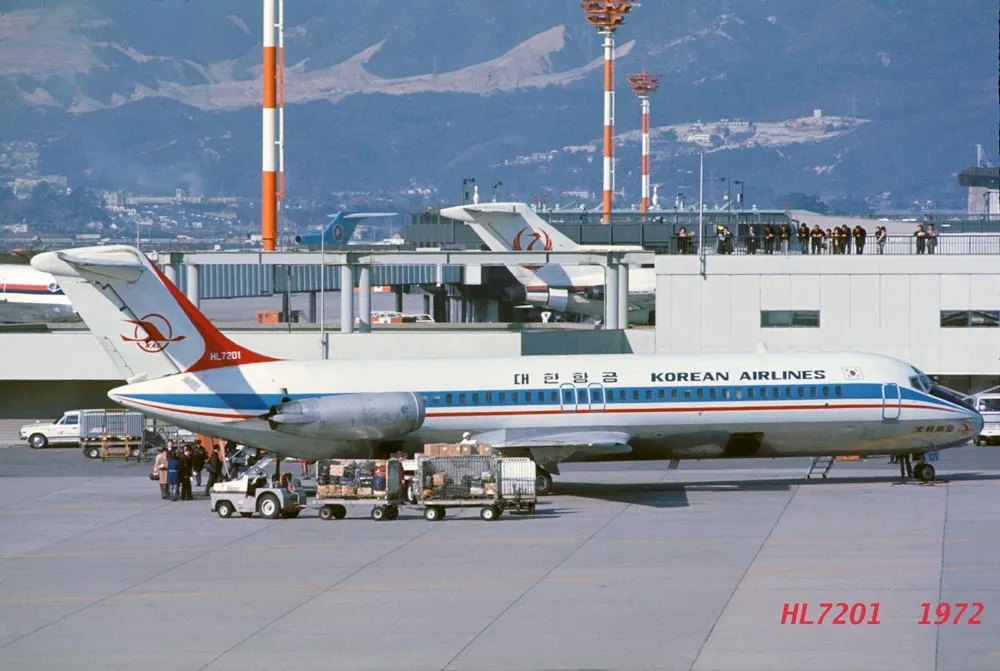 Just as a note: at that time, the aircraft wore the classic โKALโ livery (white fuselage with blue/green cheatlines and โKorean Air Linesโ titles). The famous sky blue livery (introduced in 1984) was never applied to the DC-9, as the type had already left the fleet by the