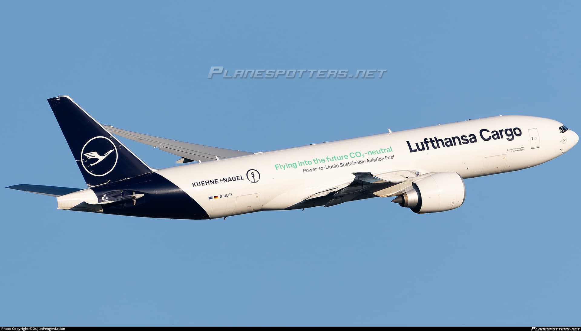 This livery should be considered in the game, as Lufthansa Cargo features a special livery acknowledging Kuehne+Nagel and Lufthansa Cargo agreement for an exclusive partnership to promote COâ‚‚-neutral power-to-liquid fuel, which can be seen across the B777LF fuselage.