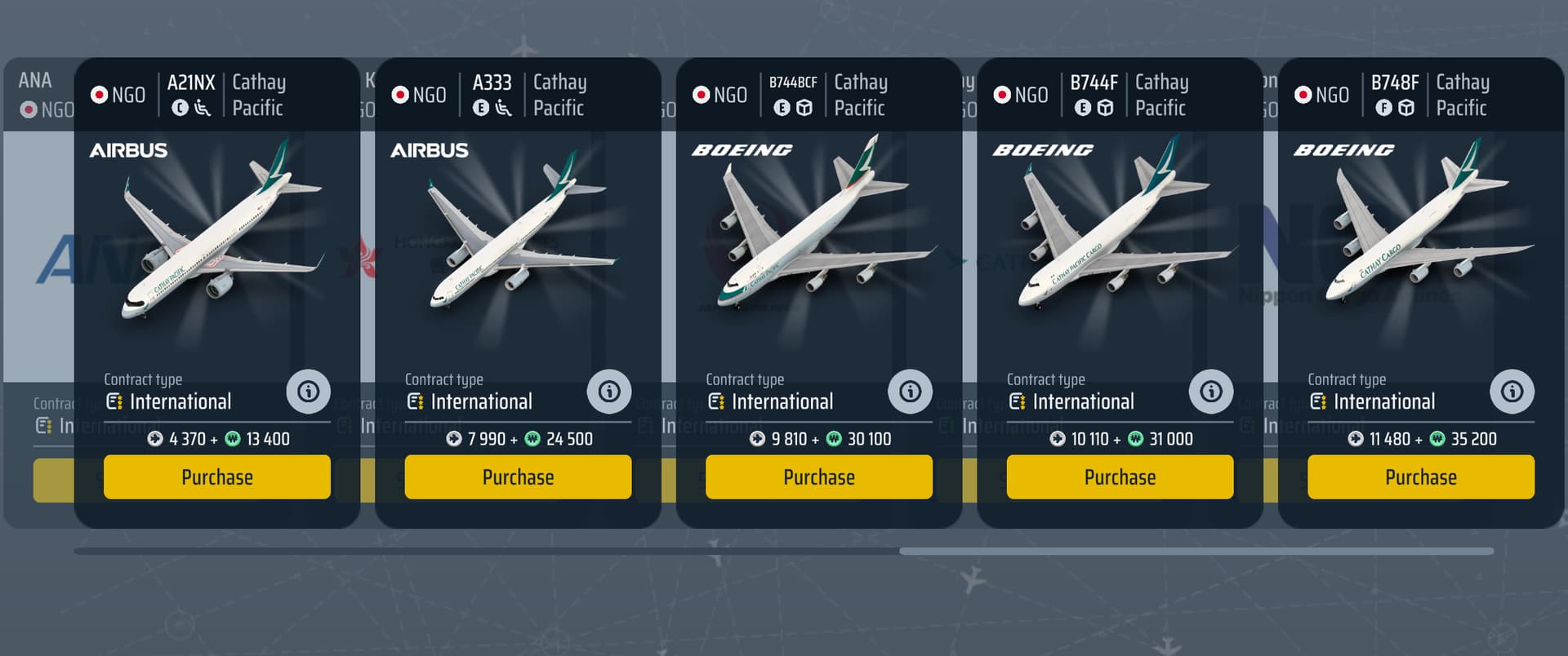 I think it’s the way the coding is set up. “Local” passenger contracts can never have D/E/F size planes. So, because Cathay Pacific is a “Local” airline, all of the D/E/F size planes do not populate as possibilities until International contracts come into play. It makes sense given MOST airports and airlines do not operate wide bodies on short routes. But this airport is an exception, and Cathay uses wide bodies on even the shortest route to CAN, which is less than 100 miles away. In Europe and the US, this rarely happens (outside of a few select hub-hub routes), but in Asia (such as with BKK) it happens quite frequently and makes play a little less than realistic.
