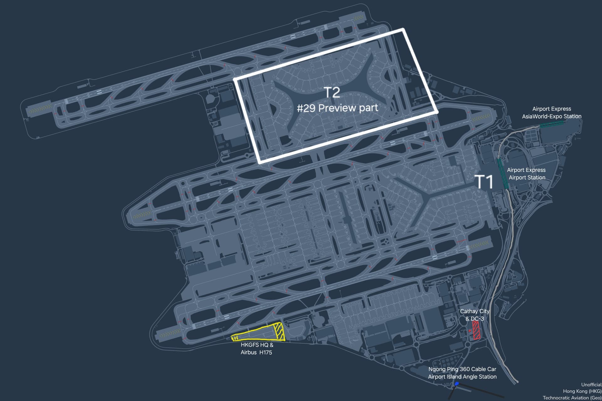 1. Cathay Pacific DC-3 (VR-HDA): This would logically be placed near the Cathay City complex, which is the airlineās headquarters on the island.