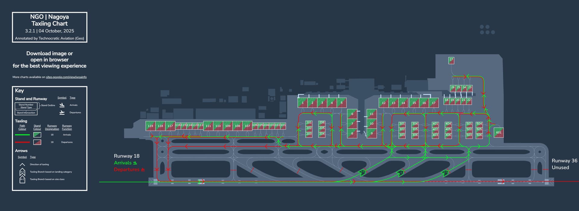 Above is another creation by Geo showing the taxiing directions for each stand and for the runway.