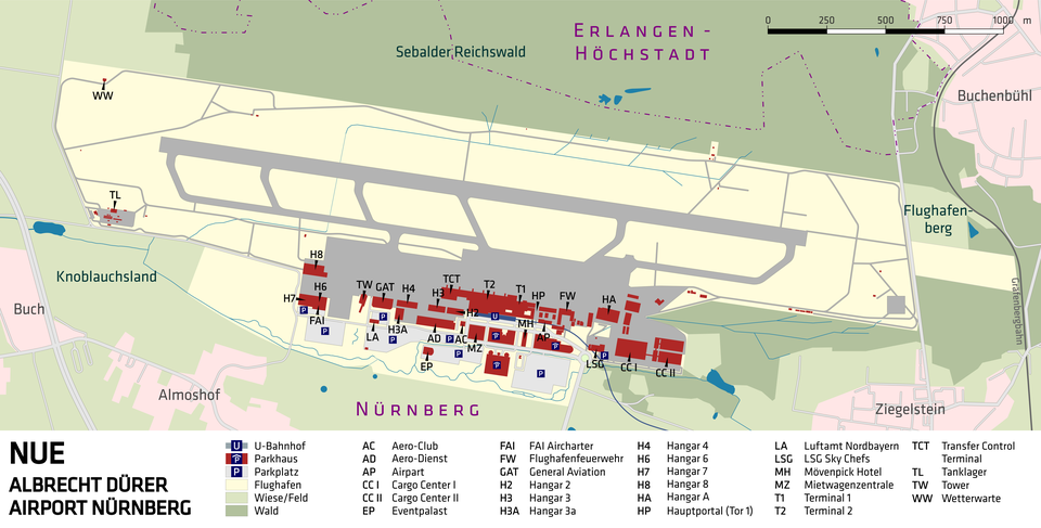 International hub and Cargo hub, with one runwayNuremberg Airport is an international airport serving the Nuremberg metropolitan region. It is the second-largest airport in Bavaria and offers connections to numerous European and North African destinations. Typical features of Nuremberg Airport: International airport: It handles both domestic and international flights, serving travelers from home and abroad. Second-largest airport in Bavaria: It is the second-largest airport in the Free State of Bavaria after Munich Airport. Proximity to the city and easy access: The airport is known for its proximity to the city and its direct subway connection (U2 line), ensuring short and convenient routes for travelers. One terminal: The airport has a single terminal with two departure halls and one arrival area, ensuring a compact and well-organized structure. Regional importance: It is an important driver of international tourism to Northern Bavaria and plays a central role in the region.