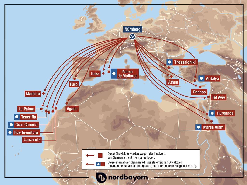 From Nuremberg Airport (NUE), airlines such as Ryanair, Eurowings, Marabu, Wizz Air, Lufthansa, and others fly to numerous destinations in Europe, North Africa, and the Middle East, including popular destinations such as Mallorca, Rome, London, Antalya, Istanbul, and Tirana. Nuremberg Airport offers a total of around 60 direct destinations.