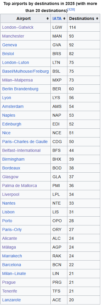 From Wikipedia, all the easyJet UK bases are represented in-game but Lyon, Berlin, Nantes, Paris (Both), Bordeaux (Ryanair is available here even though it left the airport in May 2024) and Palma amongst others are missing,Also included a screenshot from Planespotters of easyJet Europe bases and where they should be able to be acquired from.