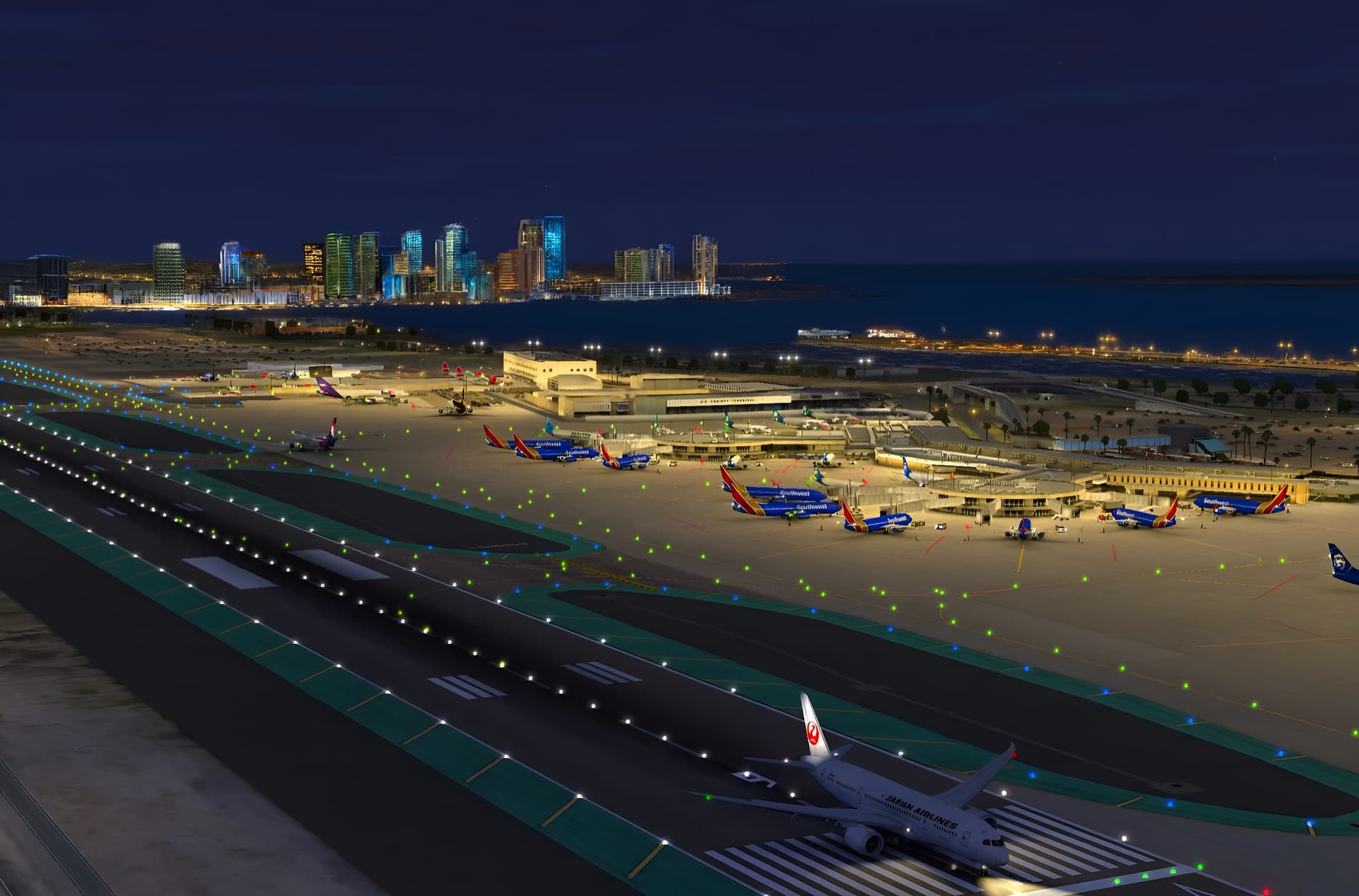 The photo above is what San Diego’s city skyline at night would look like in the game if this feature were implemented! I know you only mentioned terminals being illuminated within this topic, but adding light effects to the city skyline at these airports would really bring a lot of life to these cities at night!