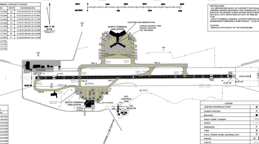 The Cargo and Passenger terminals are on either side of the runway which results in most traffic crossing the runway before takeoff