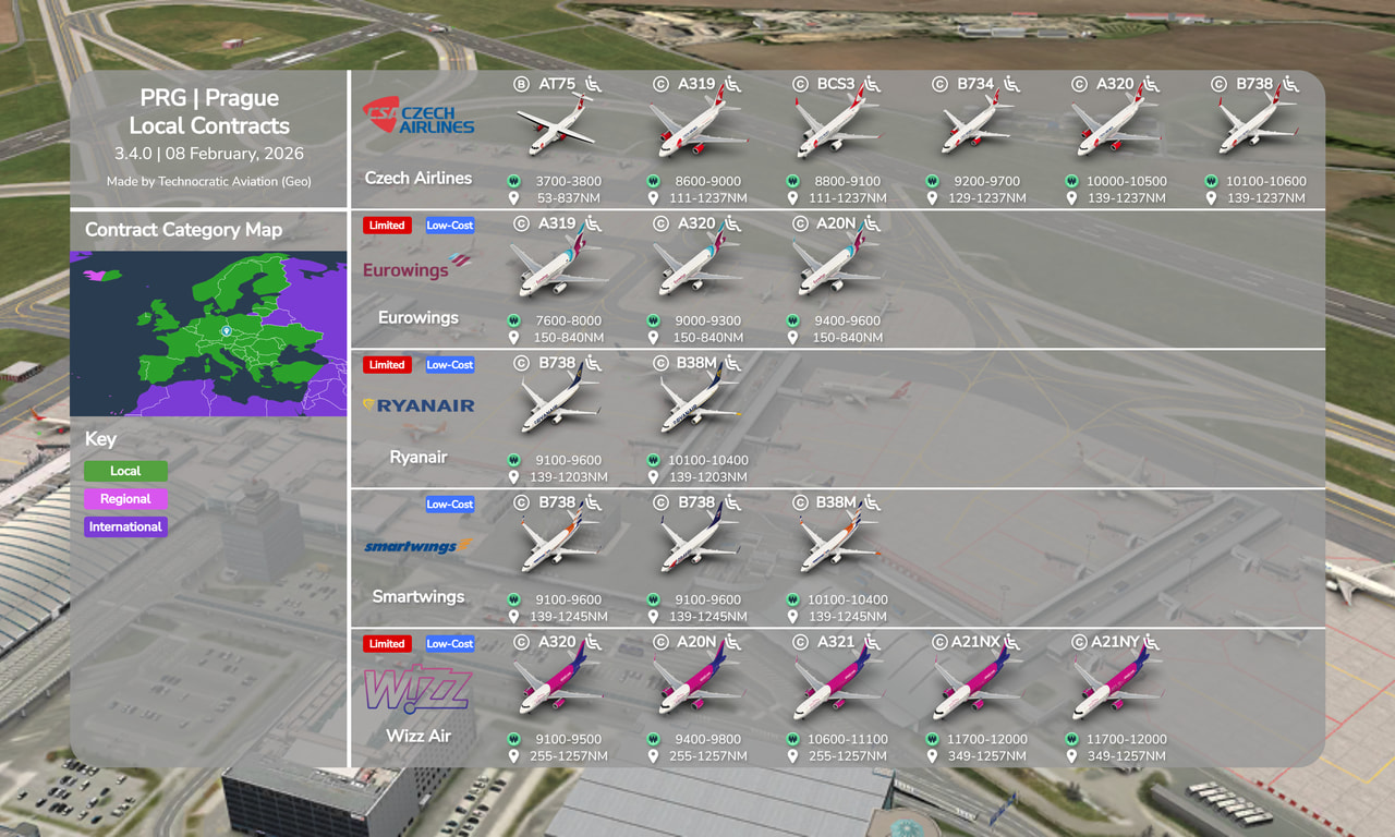 All aircraft categories are accepted at PRG. Airlines are mostly European, and tend to be low-cost carriers like Ryanair, Wizz, and Smartwings.