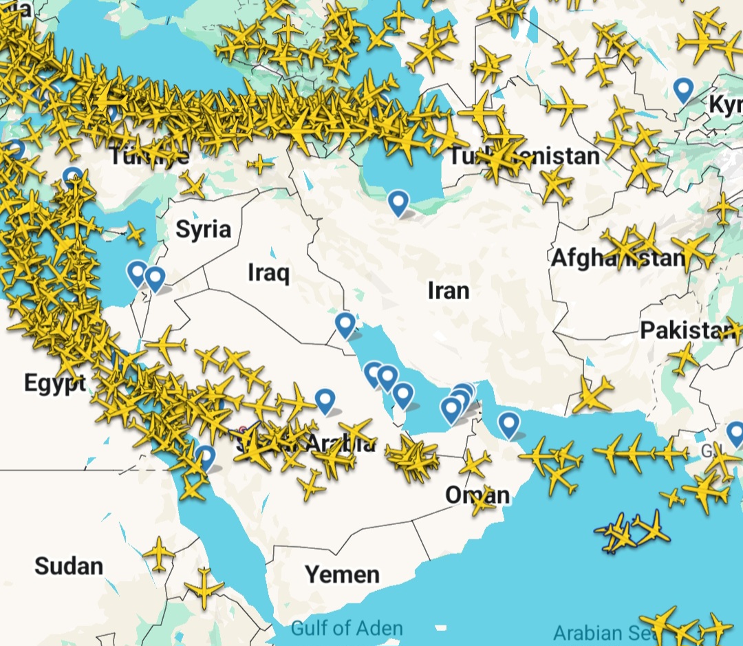 All flights in and out of Jordan, UAE, Qatar, Kuwait, and Bahrain have been cancelled or diverted. Its an odd sight seeing the airspace so empty.
