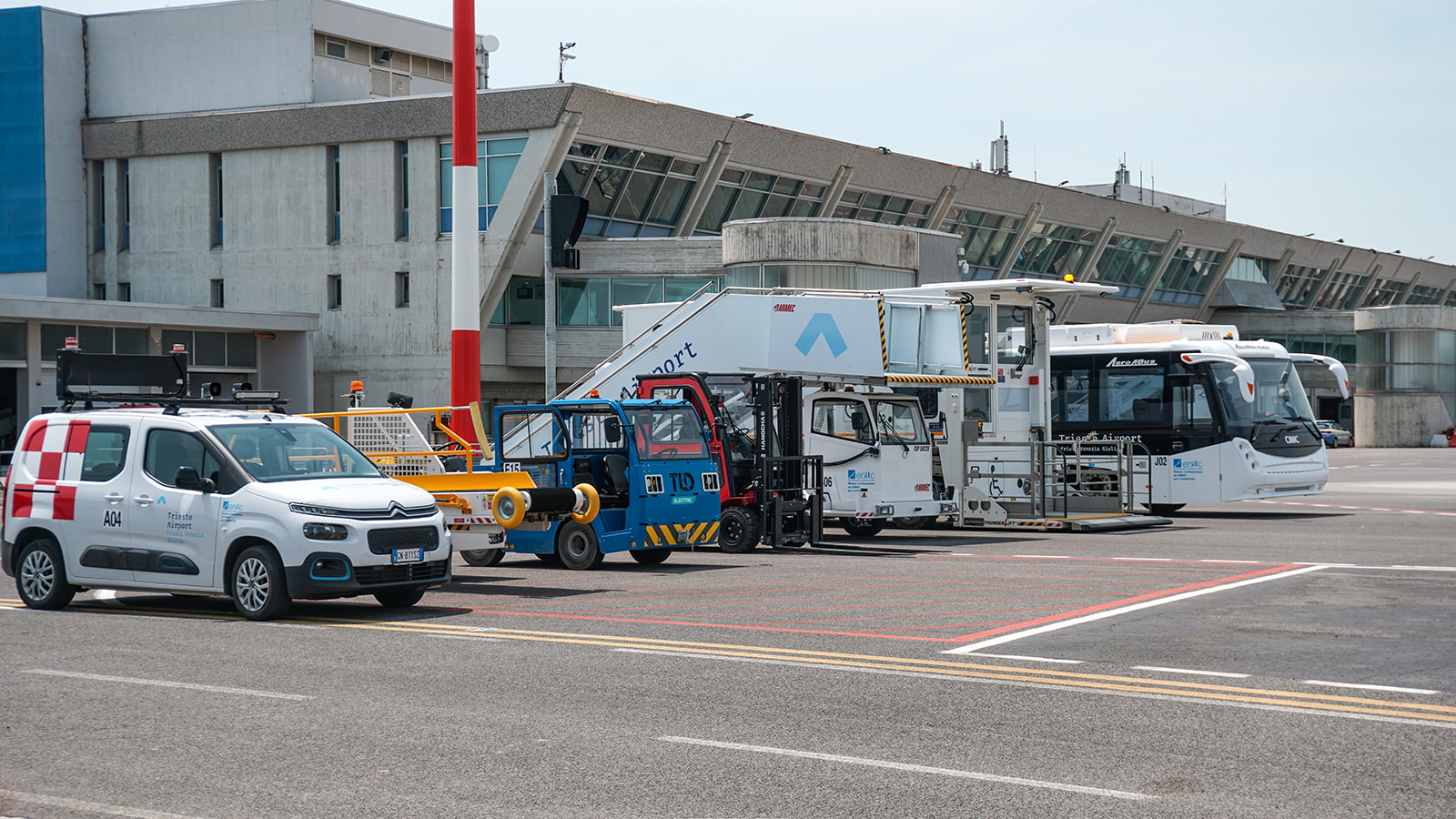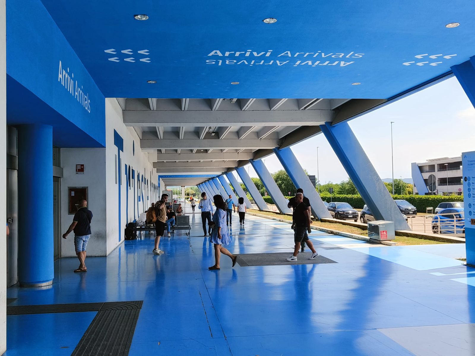 (photo before the current work on the mobility in front of the airport,the color of the Terminal are still the same)The main structure of Trieste Airport is an example of linear and efficient airport architecture. The terminal was designed to minimize travel times, with a horizontal design, parallel to the runway.