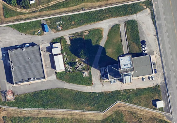The airport fire station is positioned to the side and almost exactly in the middle of the runway, this placement is required by law: the Fire Brigade must be able to reach any point of the runway and infrastructure within 3 minutes of an emergency call.