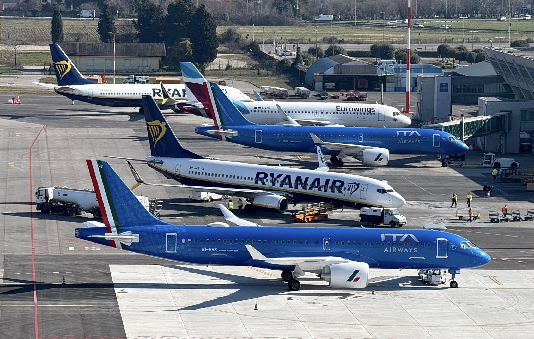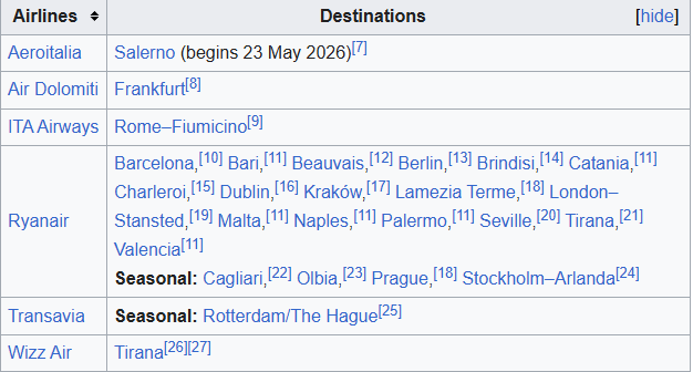 Ryanair, ItaAirways, Air Dolomiti, WizzAir. During summer other airline are: SundAir, TUIfly, Transavia, Condor, ecc.