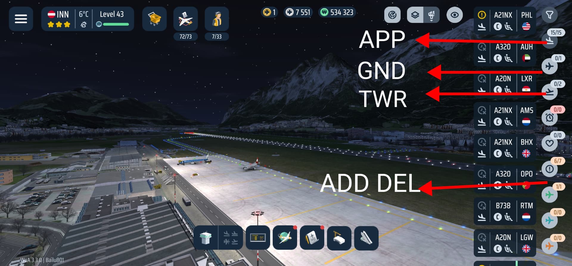 TWR :This displays takeoff and landing aircraft, as well as aircraft on the runway.GND(INN/BRI):Ground taxiway aircraft