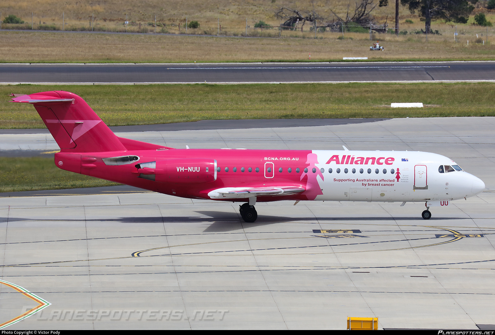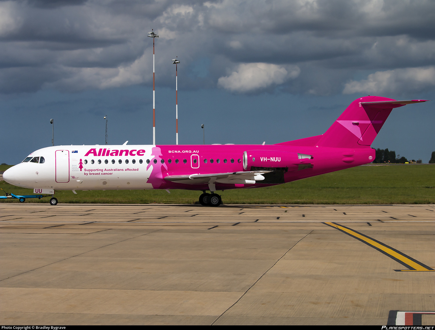 A special livery applied to one of Alliance Airlines Fokker 70s showing their support for the Breast Cancer Network Australia.